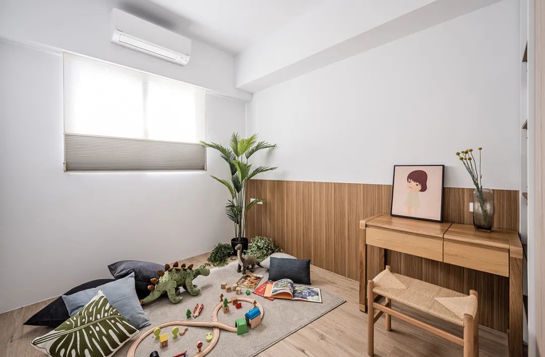 只是用木纹饰面板包覆墙面, 并预留摆放书桌的空间,可以随着孩子年龄变化,满足各阶段所需。