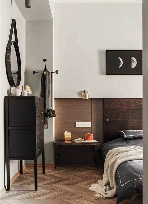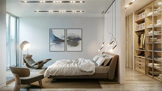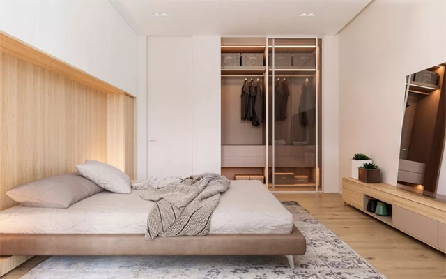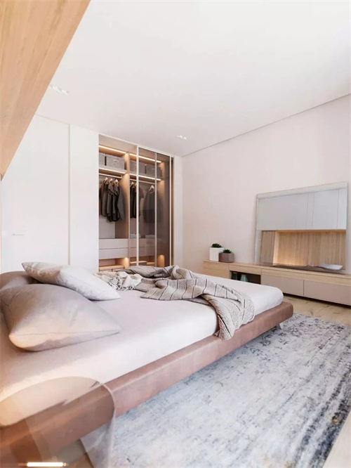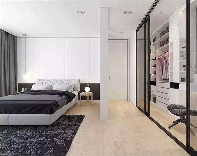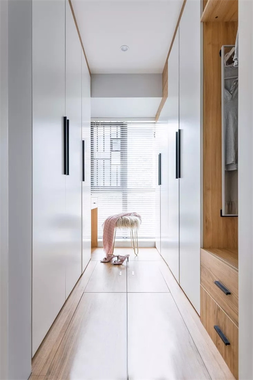 这种带衣帽间的卧室真的超级方便,晚上睡觉前把睡衣脱下,放在拐角的柜子里,拿取都很方便。